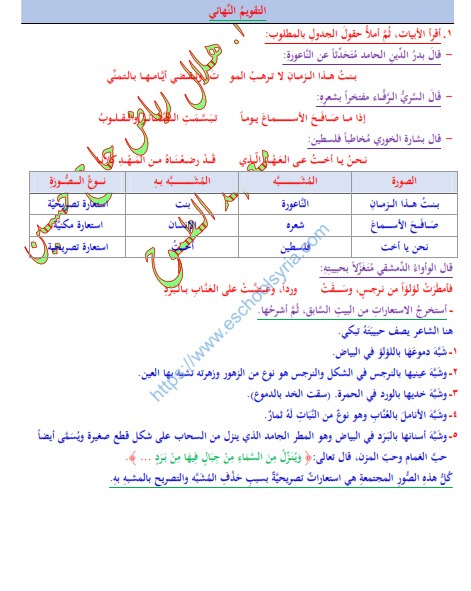 حل درس الاستعارة في اللغة العربية للصف التاسع الفصل الاول