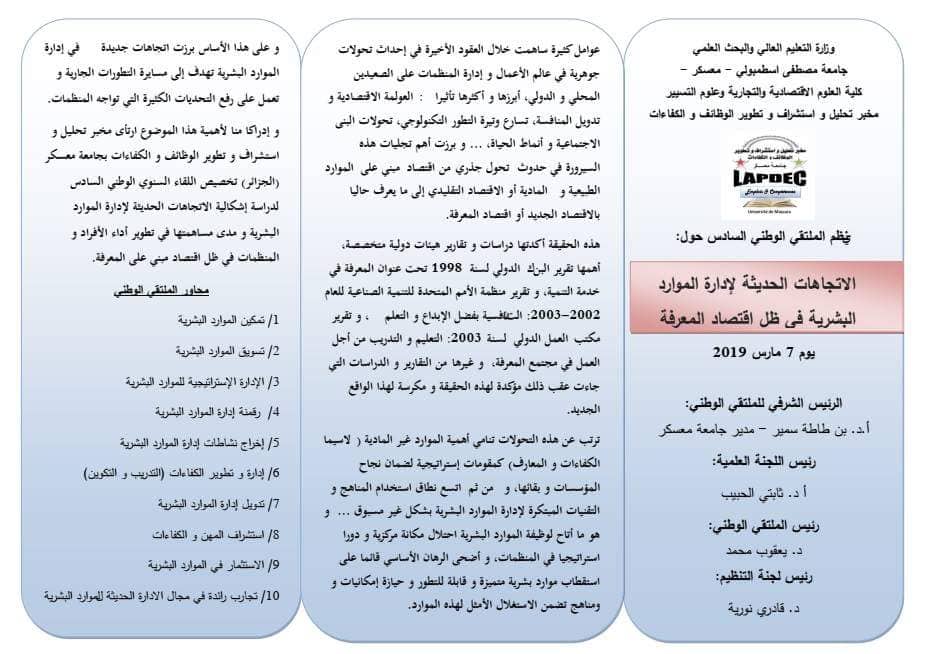 مدونة المؤتمرات العلمية والندوات وورش العمل والدورات التدريبية 2019 03 07 الملتقى الوطني السادس حول الاتجاهات الحديثة لادارة الموارد البشرية في ظل اقتصاد المعرفة الجزائر