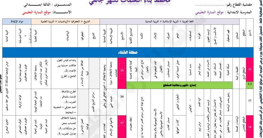 التوزيع الشهري لشهر جانفي للسنة الثالثة ابتدائي الجيل الثاني وورد Word