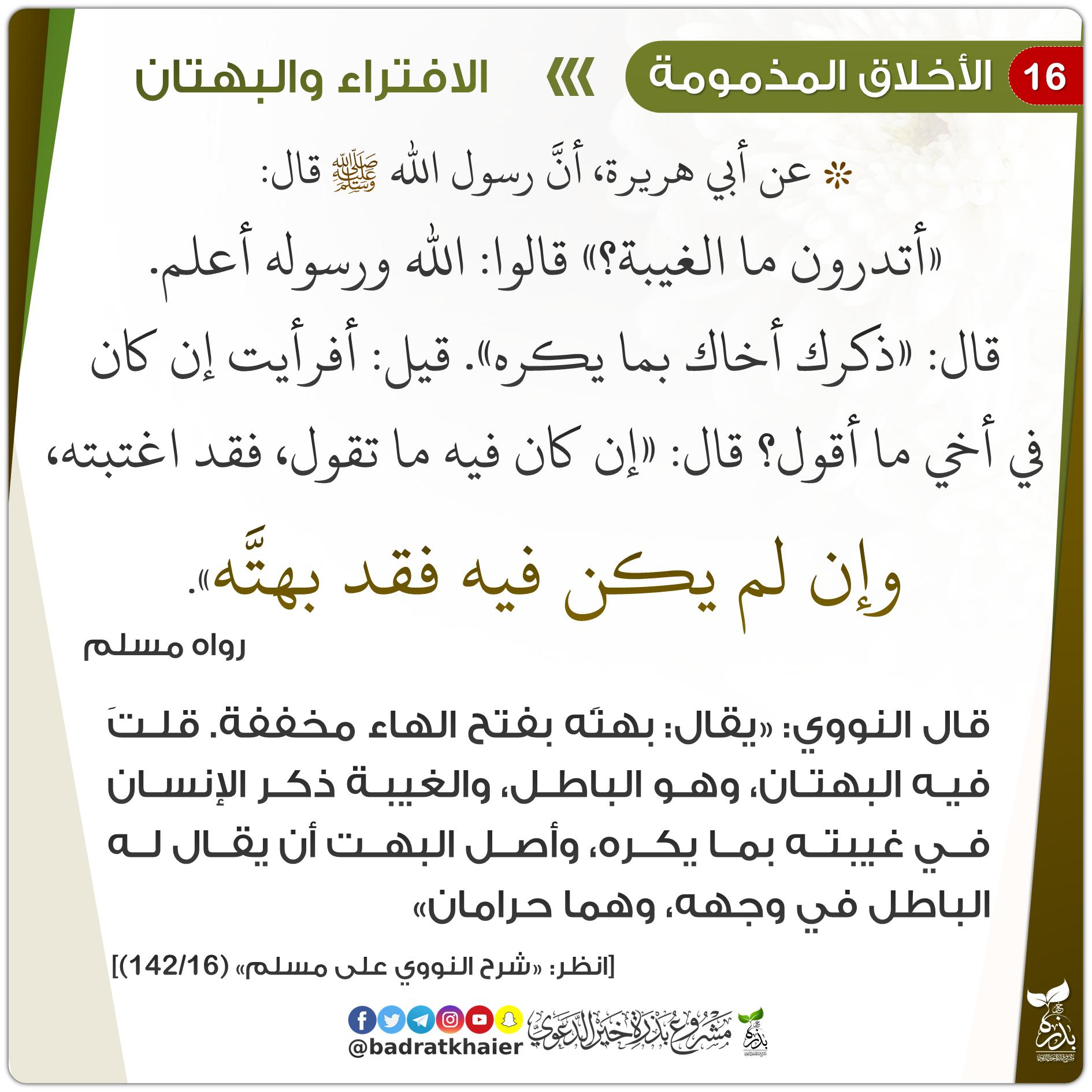 مشروع بذرة خير الدعوي Di Twitter التحذير من الإفتراء والبهتان بطاقة جديدة الإفتراء البهتان الأخلاق المذمومة الأخلاق السيئة الافتراء اختراع قضية لا أصل لها البهتان من البهت وهو أن تستقبل أخاك بأن تقذفه