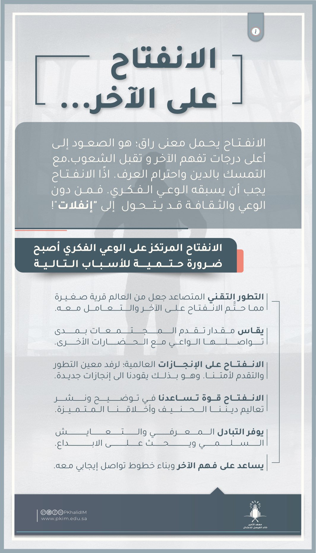 معهد الاعتدال V Twitter الانفتاح على الآخر عامل مهم في صناعة الاحترام بين الثقافات وهو لايعني الخروج عن المألوف وعن الثوابت الاجتماعية أو الدينية إنه الاعتزاز بالهوية الذاتية وتقبل اختلاف هوية الآخرين