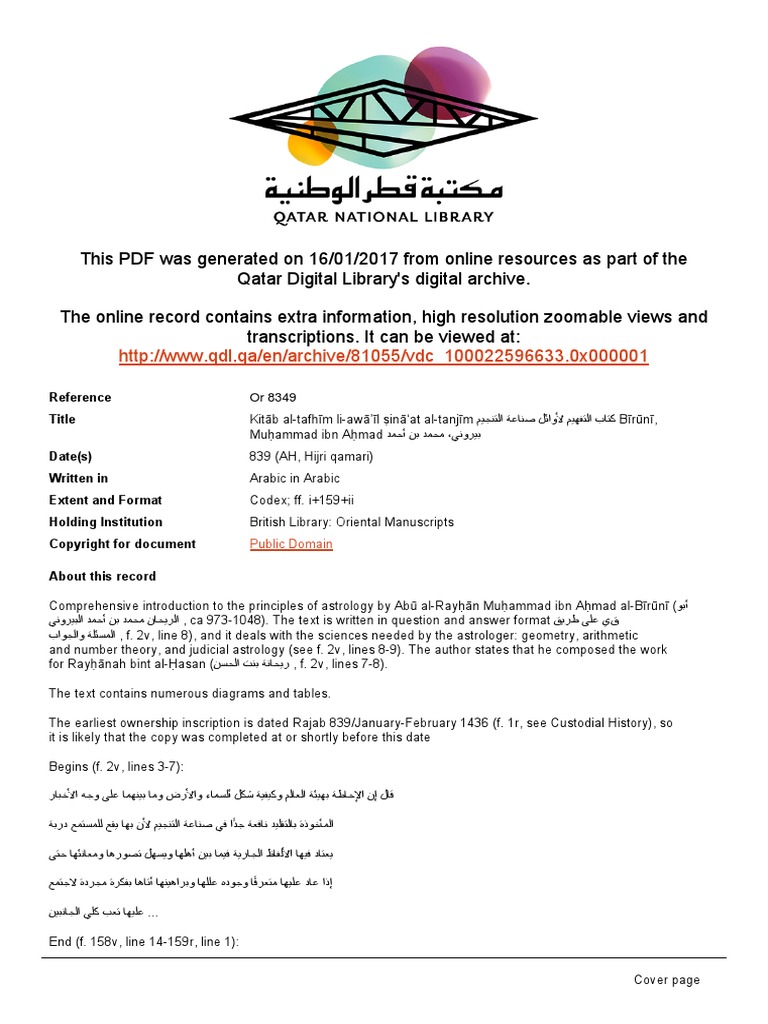 تحميل كتاب وصف مخطوط كتاب التفهيم لأوايل صناعة التنجيم الطاهر الرجراجي Pdf مكتبة نور لتحميل الكتب الإلكترونية