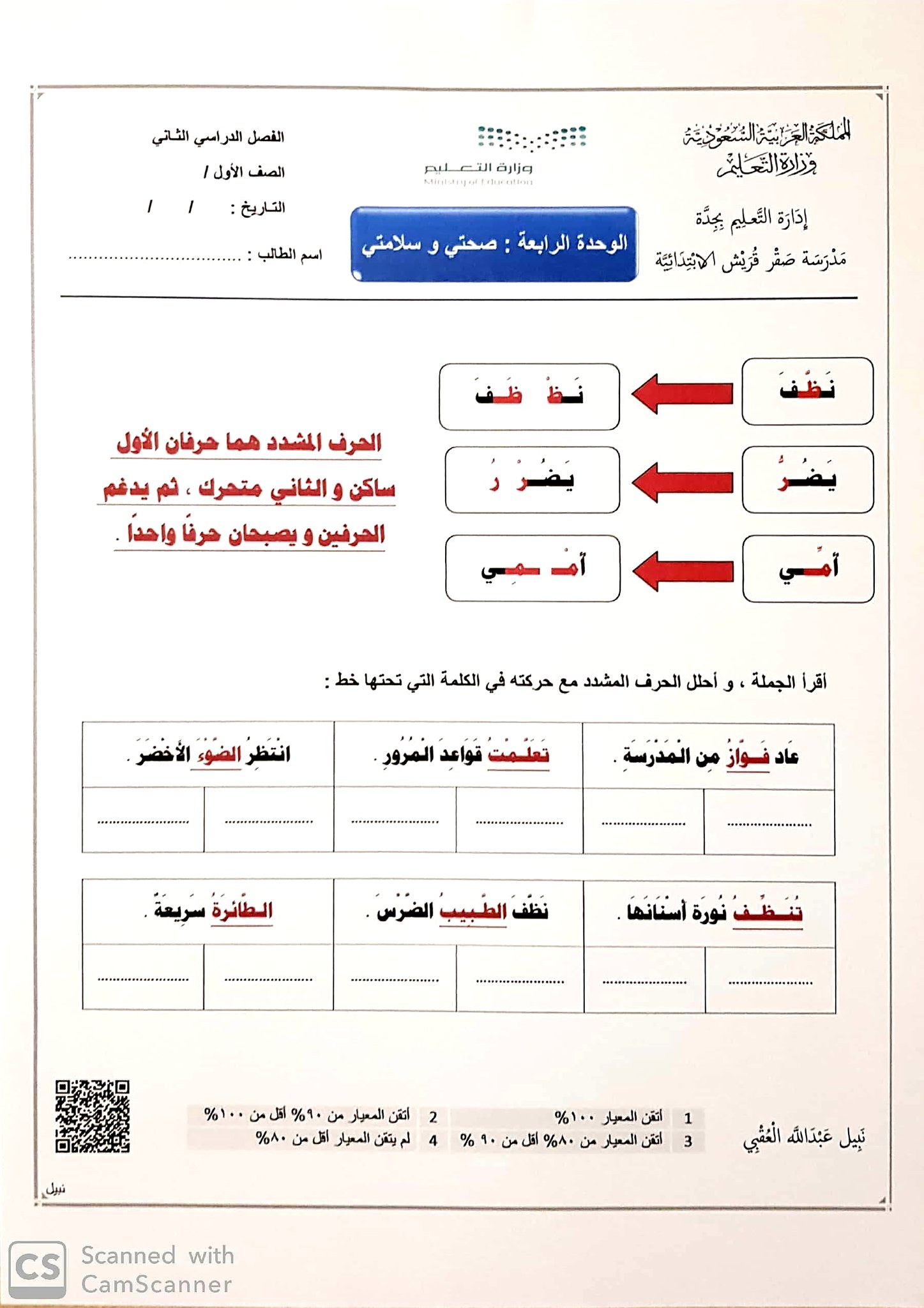 أوراق عمل مراجعة لحركة الشدة للصف الأول مدرسة وروضة نزهة المتقين Facebook