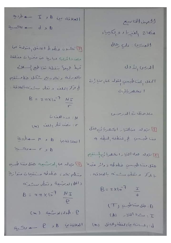 الحقل المغناطيسي المتولد عن تيار كهربائي للصف التاسع
