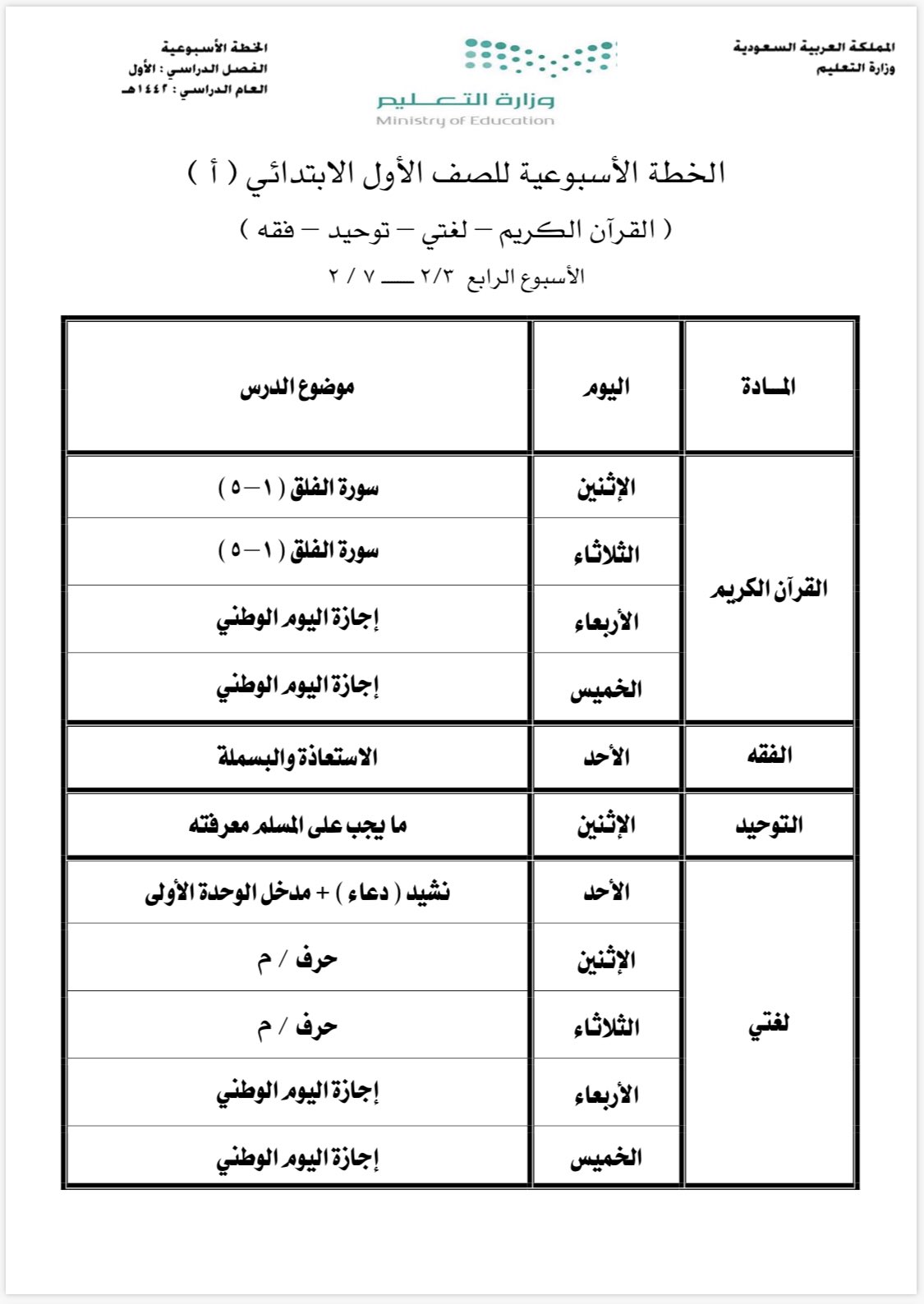 الخطة الأسبوعية للصف الأول الصف الأول المناهج الفصل الأول المناهج السعودية