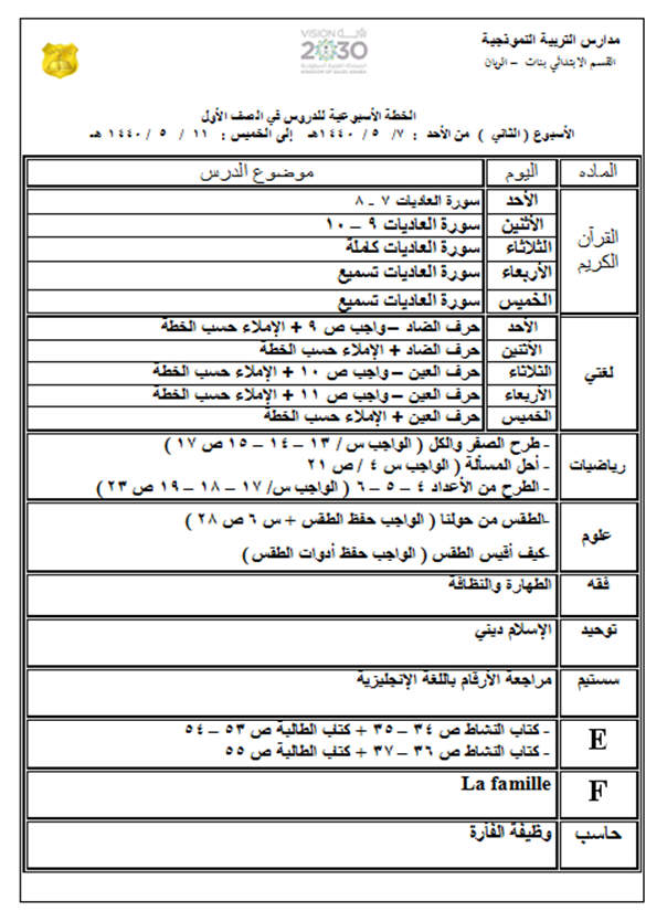 الابتدائية بنات الريان الخطة الأسبوعية للصف الأول الأسبوع الثاني