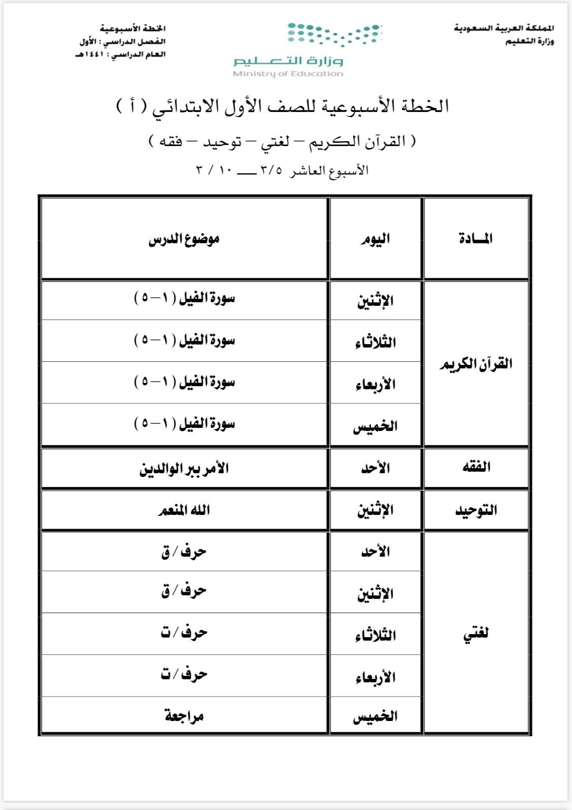 الخطة الأسبوعية للصف الأول الصف الأول المناهج الفصل الأول المناهج السعودية