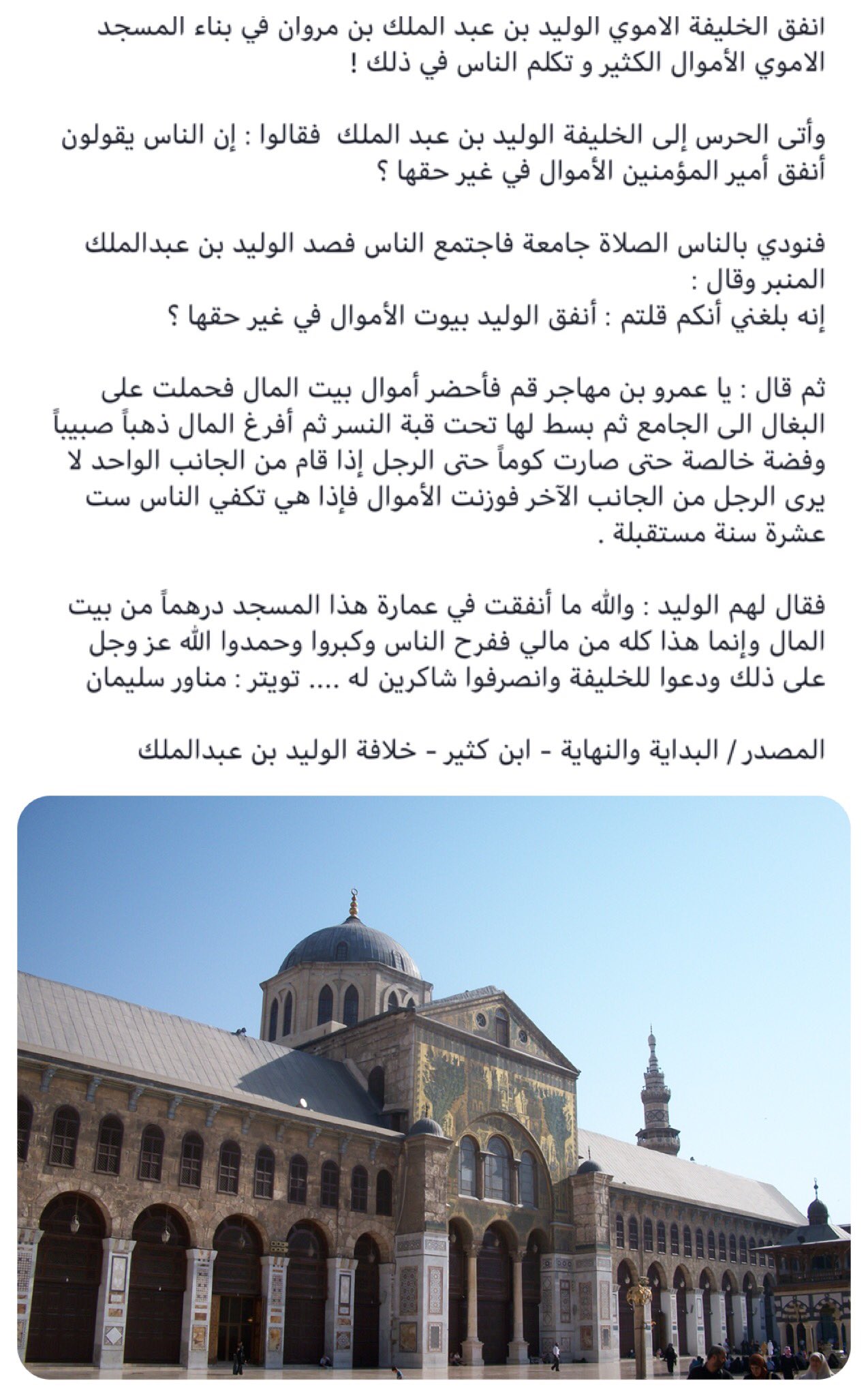 مناور سليمان V Twitter أنفق الخليفة الاموي الوليد بن عبد الملك في بناء المسجد الاموي الأموال الكثير و تكلم الناس فقالوا أنفق أمير المؤمنين الأموال في غير حقها Https T Co 5yqokpsn3y