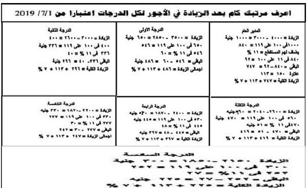 اعرف مرتبك وقيمة الزيادة الصافى فى الاجور لكل الدرجات الوظيفية من الاولى الى السادسة اعتبار من 1 7 2019