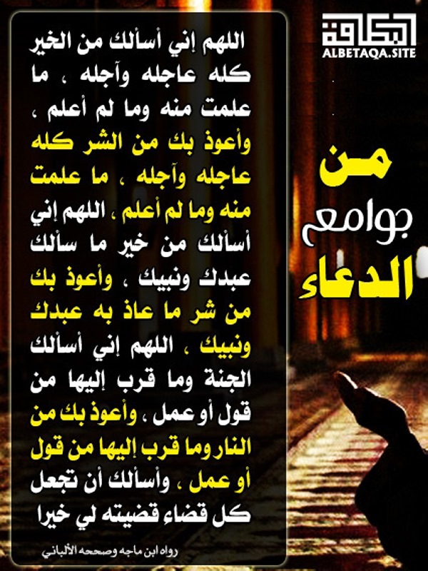 من دعاء الرسول صلى الله عليه وسلم اللهم إني أسألك من الخير كله عاجله و آجله ما علمت منه وما لم أعلم وأعوذ بك من الشر كله عاجله و آج Islam