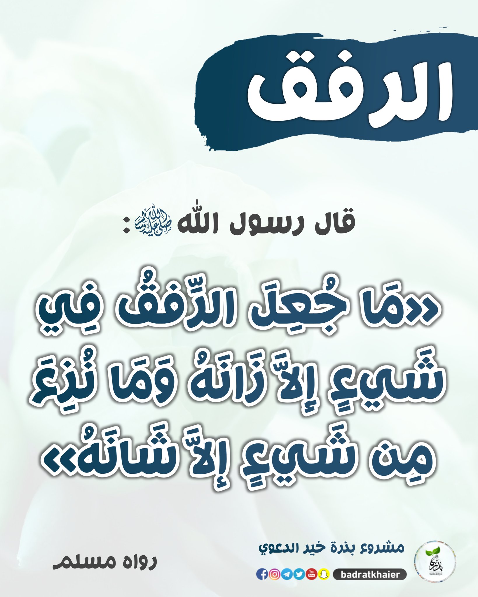مشروع بذرة خير الدعوي On Twitter الرفق هو لين الجانب بالقول والفعل والأخذ بالأسهل وهو ضد العنف وقد يجيء الرفق أيض ا بمعنى التمهل في الأمور والتأني فيها Https T Co Mvah7jrj3z