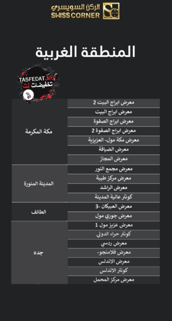 اذا كان لديك حساب لدينا من فضلك قم بتسجيل الدخول. الركن السويسري swisscorner. ١ اسواق طيبة ٢ اسواق الاندلس كشك ٣ المملكة مول دور البلازا الاول كشك ٤ حياة مول يسار بوابة واحد جهة جنيفر كشك ٥ الرياض جاليري الأرضي بوابة سته يسار بوابة اربعة جهة اتش ام.