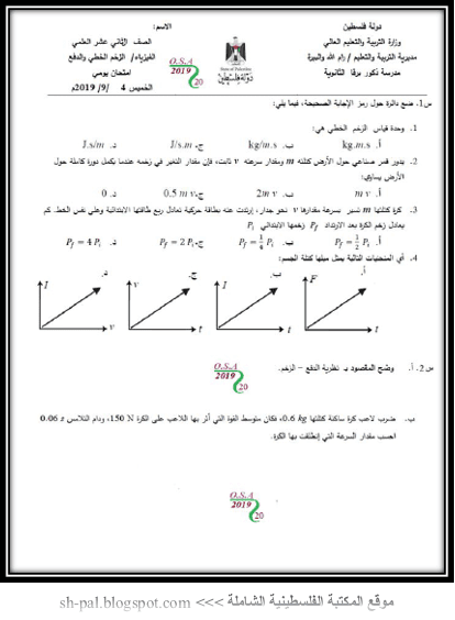 امتحان فيزياء لدرس الزخم الخطي والدفع للصف الثاني عشر المكتبة الفلسطينية الشاملة