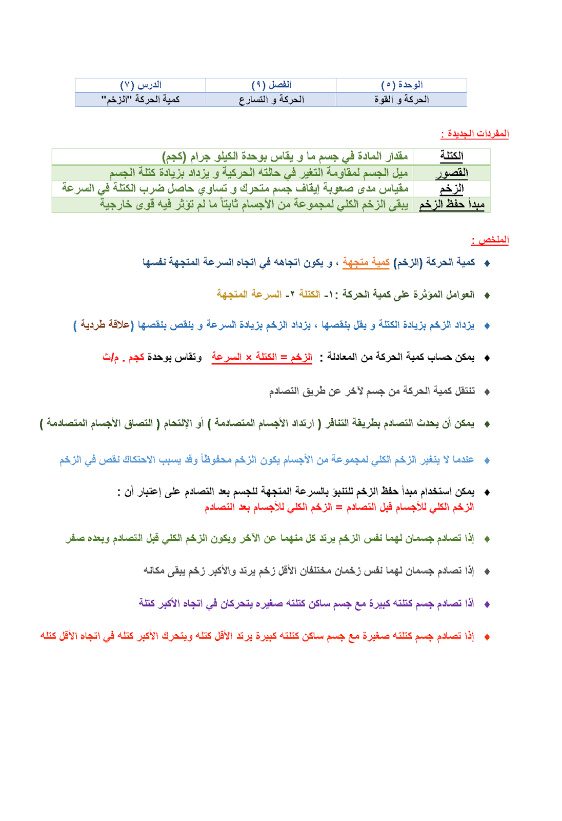 علوم ثالث متوسط الفصل الدراسي الثاني الزخم