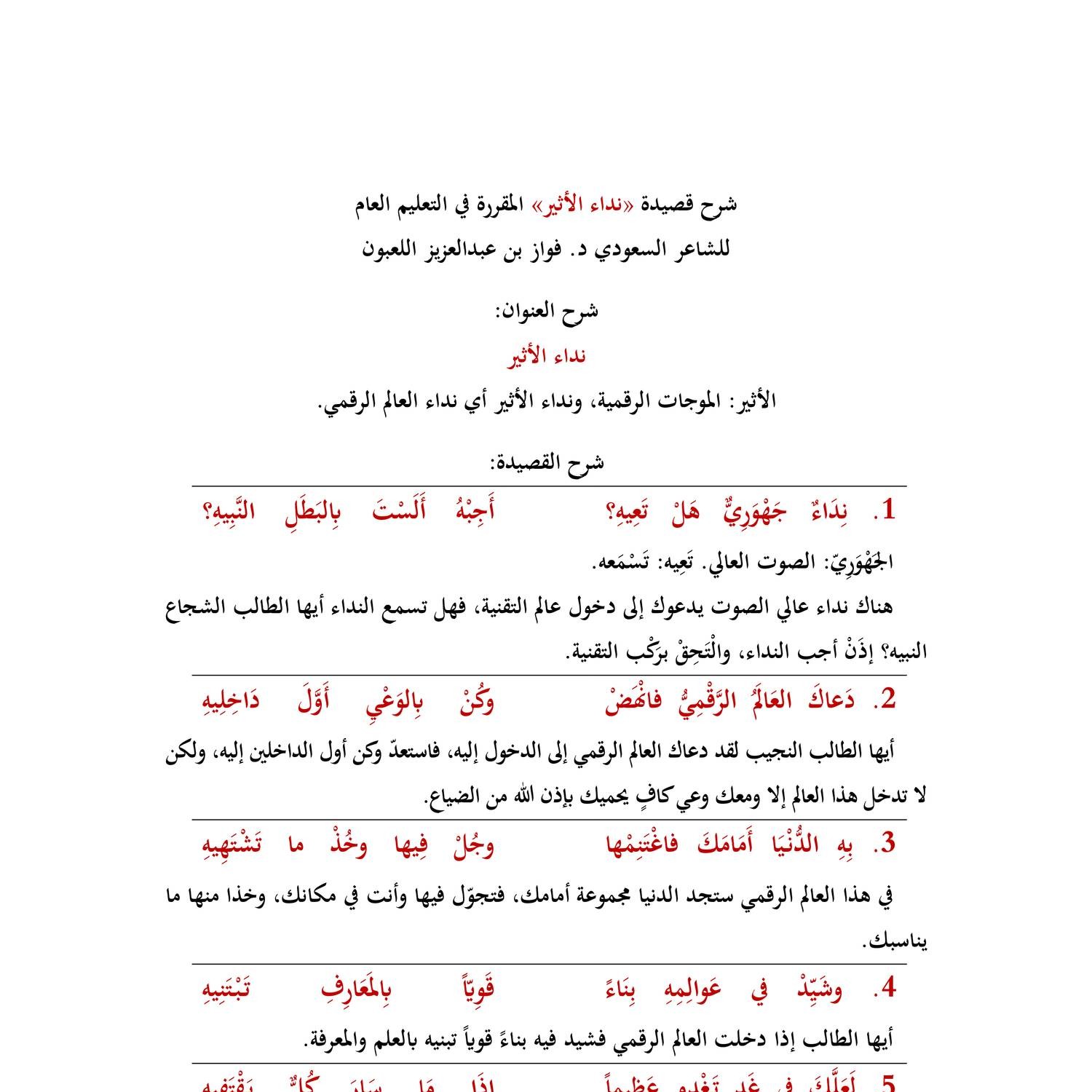 شرح قصيدة نداء الأثير د فواز اللعبون Docx Docdroid
