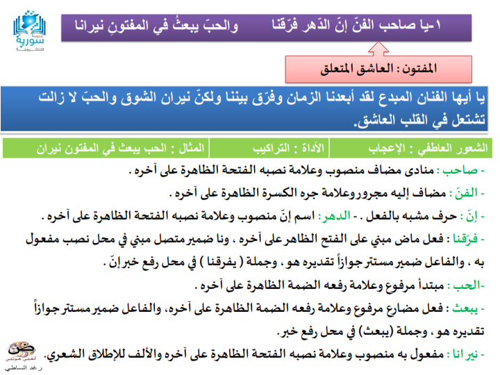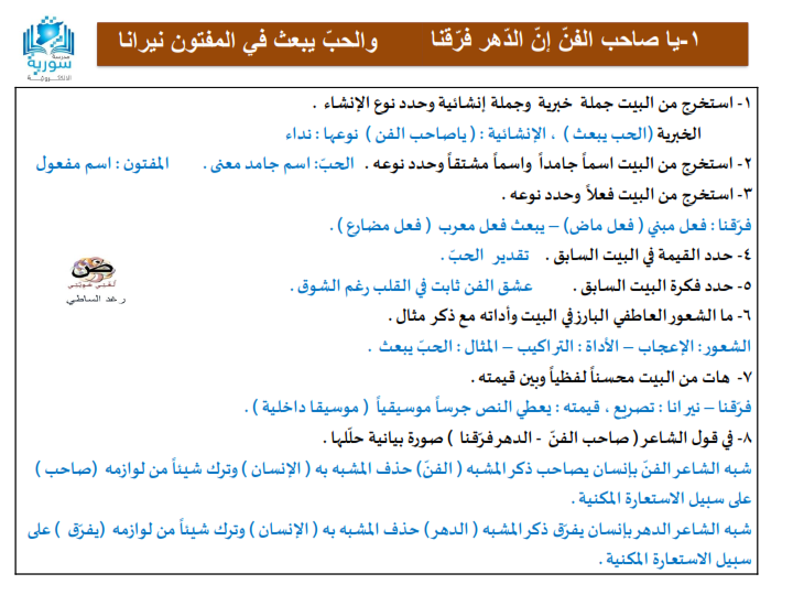 تاسع شرح وإعراب قصيدة في حضرة الفن منصة أونلاين التعليمية السورية Facebook