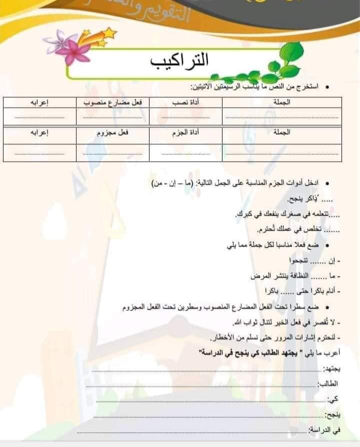 تمارين داعمة في التراكيب و الصرف و التحويل الوحدة السادسة الأسبوع الأول المستوى الرابع