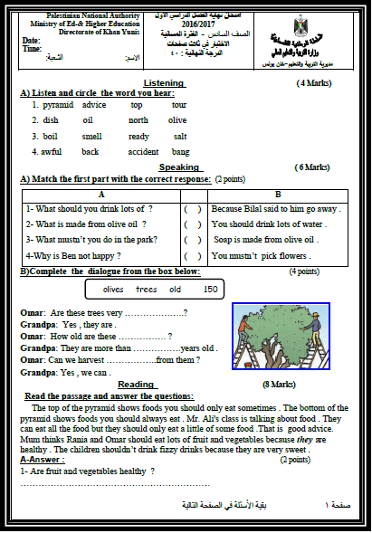امتحان نهاية الفصل الأول في اللغة الانجليزية للصف السادس مسائي المكتبة الفلسطينية الشاملة